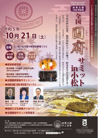 加賀立国1200年を記念し、全国の国府所在地が集い、歴史の学びと交流を推進する「全国国府サミット」を小松市で開催。歴史芸能の披露や研究家が語り合う加賀立国1200年記念フォーラム等を通じて、加賀国府誕生と国府の魅力を体感いただけます。