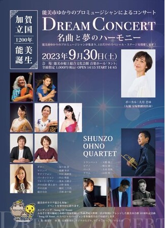 能美市観光大使を務めるトップミュージシャンたちが集い、一日だけのドリームステージを今年も開催。今回は、加賀立国能美誕生1200年の節目の年を祝い、イラストのスライドを使って郷土愛と学びを深める特別プログラムを実施します。また、ふるさと愛の醸成と市政の発展を願い、作曲者の大野俊三氏が特別にアレンジした能美市合併10周年記念曲「Song Of Nomi」のスペシャルバージョンを参加者全員でお届けします。