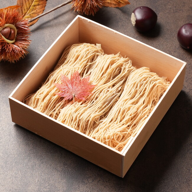 ひんやりつるんとした葛の中に和栗と3種類の餡(こし餡・栗餡・カスタード) がはいっており、その上にたっぷりの和栗ペーストがのったモンブランで、専用のお重入りなので大切な人へのお土産としても人気です。