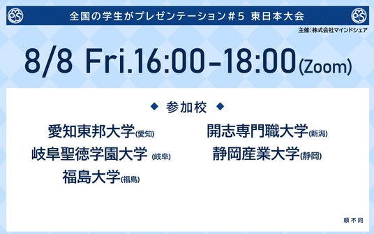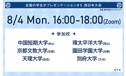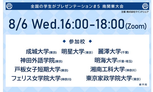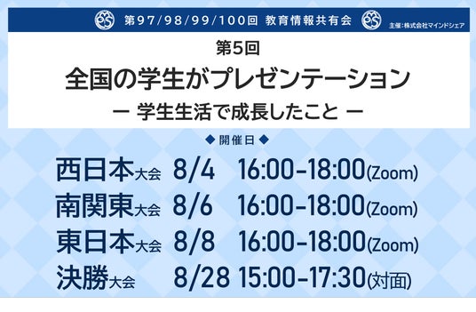 今回は、今年度で5度目の開催となる「学生プレゼン大会」のご案内です。本大会は西日本、南関東、東日本の3エリアに分け、オンラインにて実施し、各エリアから選ばれた7名が8月28日(木)に開催する決勝大会に進み、対面形式でプレゼンを行います。