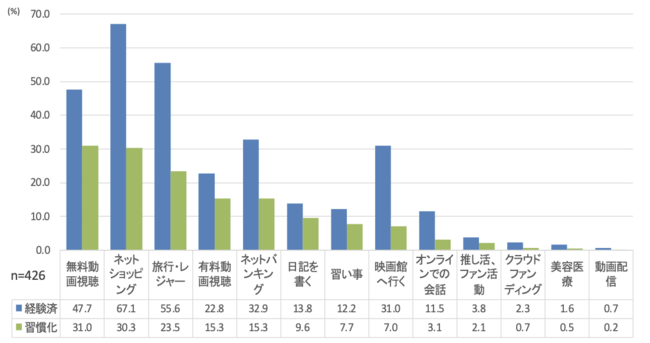 また、習慣化とまでは言わずとも、ここ最近で経験したことがあることについては「ネットバンキング」が32.9%であり、zoomなどの「オンラインでの会話」も11.5%となっていました。