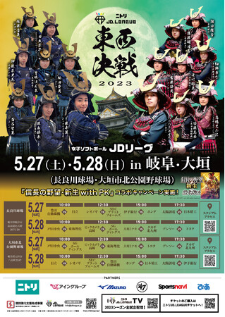 一般社団法人 日本女子ソフトボールリーグ機構(所在地:東京都新宿区霞ヶ丘町4-2 10階、代表理事:三宅 豊、島田 利正)は、5月27日(土)・28日(日)に長良川球場ならびに大垣市北公園野球場で予定しているニトリJD.LEAGUE 2023交流戦シリーズの開幕節「東西決戦in岐阜・大垣」開催に際して、「令和の関ケ原」オリジナルポスターを制作し、岐阜県内各所に掲示いたしますことを下記のとおりお知らせいたします。