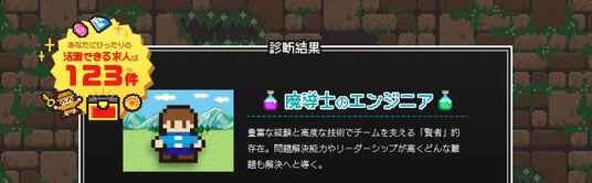 RPGをモチーフとした世界観で「勇者」「魔導士」「賢者」の3タイプの中から、あなたにマッチした冒険キャラクターを診断し、「宝箱(=マッチ率の高い求人)を見つける冒険」をお楽しみいただけます。