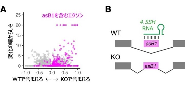 図2. 4.5SH KO細胞でのmRNAのつなぎ合わせの異常。(A)4.5SH KO細胞でmRNAに取り込まれた異常配列のプロット。KO細胞では野生型(WT)で見られない配列が多数mRNAに取り込まれておりその多くはSINE B1が逆方向に挿入された配列(asB1)を持っている。(B) 4.5SH KO細胞で見られるmRNAのつなぎ合わせの異常。4.5SHはasB1とペアを形成し、mRNAへの取り込みを強力に抑制する。asB1の多くは致死性の変異を導入するため、4.5SH RNAのKOマウスは致死となる。