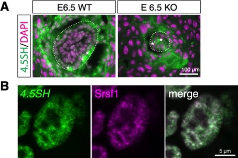 図1. 4.5SH KOマウスの発現と表現型。(A)4.5SH KOマウスの表現型。胎生6.5日(E6.5)目には野生型(WT)と比較すると胚の発育が著しく遅れ、致死となる。点線は胚の外縁。星印は自家蛍光のシグナルを示す。(B)ES細胞における4.5SH RNAの局在をin situハイブリダイゼーションで可視化したもの(緑)。mRNAをつなぎ合わせる過程に関わるSrsf1(紫)が局在する核スペックルへの局在が観察される。