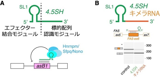 図3. 4.5SH RNAのモジュール構造とmRNAへの異常配列の取り込みを防ぐキメラ分子。(A)4.5SH RNAのモジュール構造。5'側に存在するステムループ構造はmRNAのつなぎ合わせを阻害するツールとして働くHnrnpm、Sfpq、Nonoなどの分子と結合し、3'側は標的エクソンを認識してペアを形成する。(B)任意のエクソンのスキッピングを誘導する人工キメラ分子の作製例。4.5SH RNAの標的認識配列を任意のエクソンの相補的な配列に置き換えることでエクソンスキッピングを誘導するキメラRNAを作製できる。