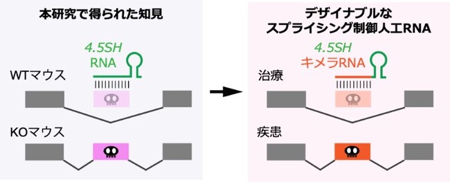 mRNAの情報はゲノムDNAに分断されて書き込まれており、それらがつなぎ合わされることで正常なmRNAが完成する。4.5SH RNAは、mRNAに取り込まれると不具合を起こす異常な配列(紫色)を認識し、mRNAへの取り込みを防ぐことで無毒化する。この仕組みを応用すると、遺伝病の原因となる変異(橙色)のmRNAへの取り込みを防ぐ遺伝子治療薬の作製が可能となる。