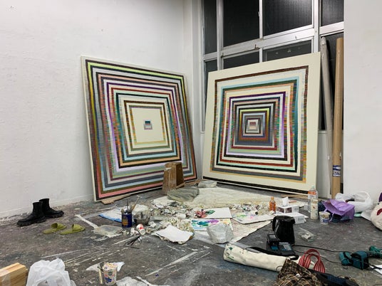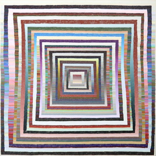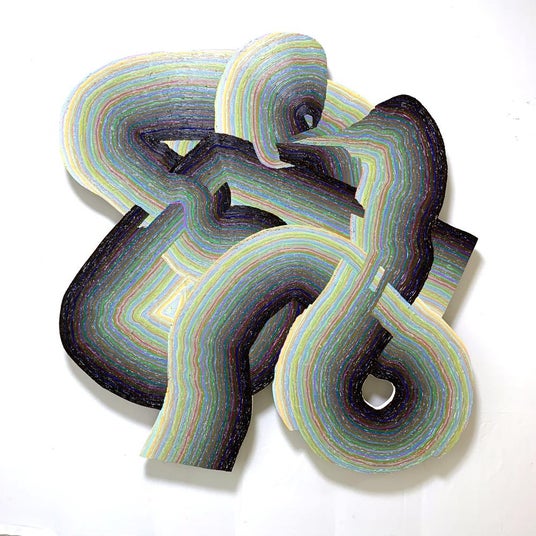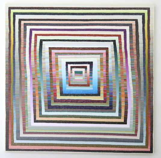 作家は、あらかじめ設定したルールに従いながらも、予期せぬ形や歪みを取り入れ、作品に独自の質感と偶然性をもたらしています。色と色の境界が曖昧になり、複雑に入り組んだ線が視覚的な驚きを生み出します。