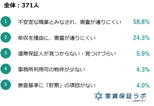 - フリーランス歴が長くても「連帯保証人を見つけづらい」「事務所利用可の物件が少ない」など新たな問題に直面