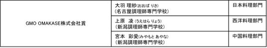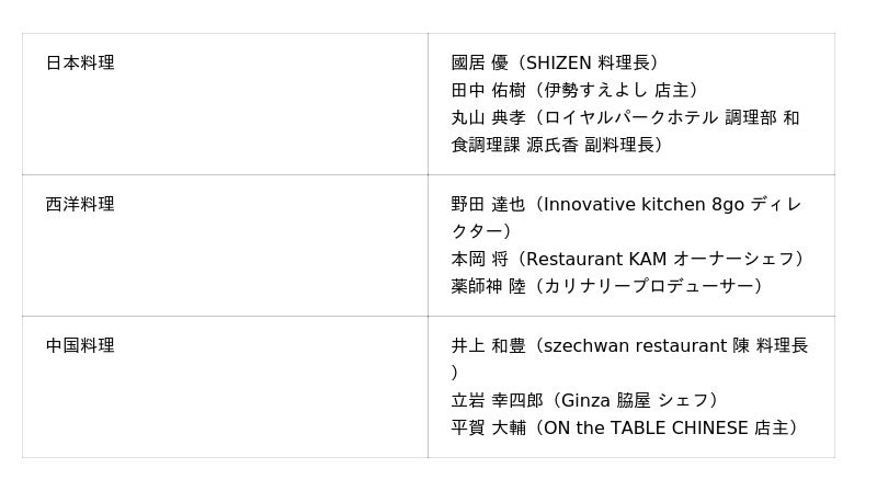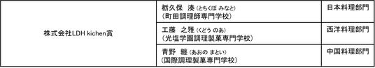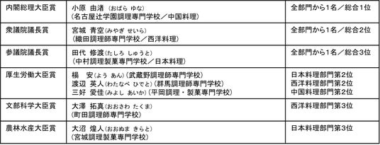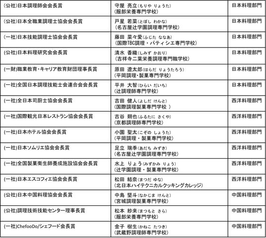 調理師学校を卒業後、活躍している料理人(9名、下表):作品・味見審査