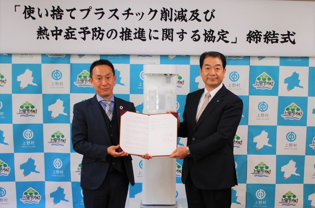 上野村と当社は、ペットボトル等の使い捨てプラスチックの削減及び熱中症予防等を推進するため、また2050年までに二酸化炭素排出量を実質ゼロにする「ゼロカーボンシティ」の実現に向け、マイボトル等に給水できる環境整備を推進します。当協定は、村内の公共施設にマイボトルへの給水が可能なウォータースタンドを設置し、ペットボトル等のワンウェイプラスチック製品の使用抑制について積極的に啓発し地球環境の維持と改善を図ることを目的に締結するものです。