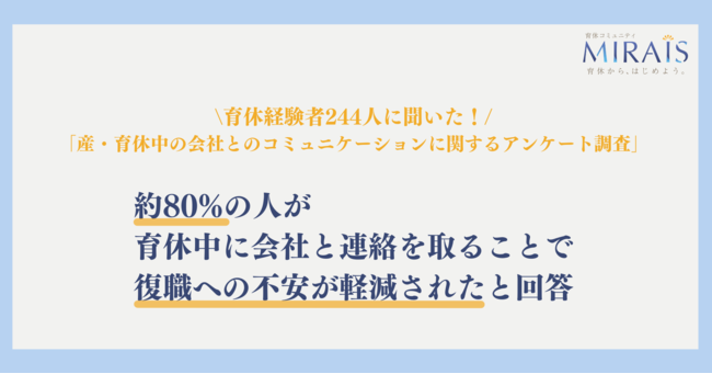 育休コミュニティ「MIRAIS」(代表 栗林真由美、以下MIRAIS)は、産・育休取得経験者244名に「産・育休中の会社とのコミュニケーション」に関するアンケートを実施、調査結果をまとめましたので、公表します。
