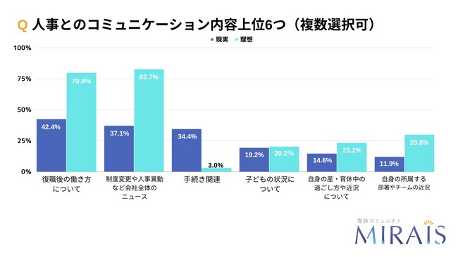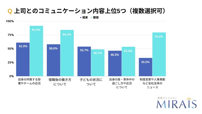 ・産・育休者は、制度変更や人事異動など会社全体のニュースや復職後の自身の働き方についてコミュニケーションを取りたいと考えている。しかし実際には、上司とは自身や子どもの近況、人事とは手続きのやり取りに留まっている人も多く、理想と現実にギャップがある。