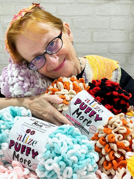 トルコ生まれの特殊なループヤーン『パッフィー』。肌ざわりはフワフワ。そして編み針不要。ループにループを通すだけで、どんどん形が出来上がります。「指編み」より簡単!「編む」と言うより、パズルをしている感覚でしょうか。編み物未経験の方にも是非お試し頂きたいおすすめアイテムです。