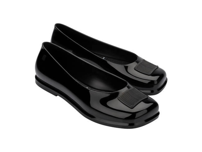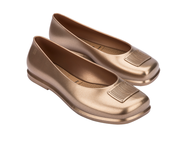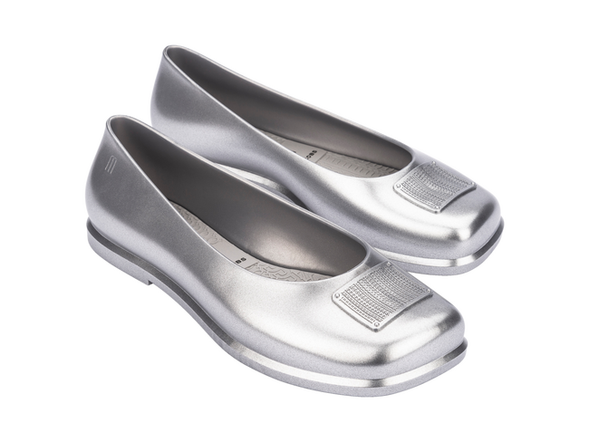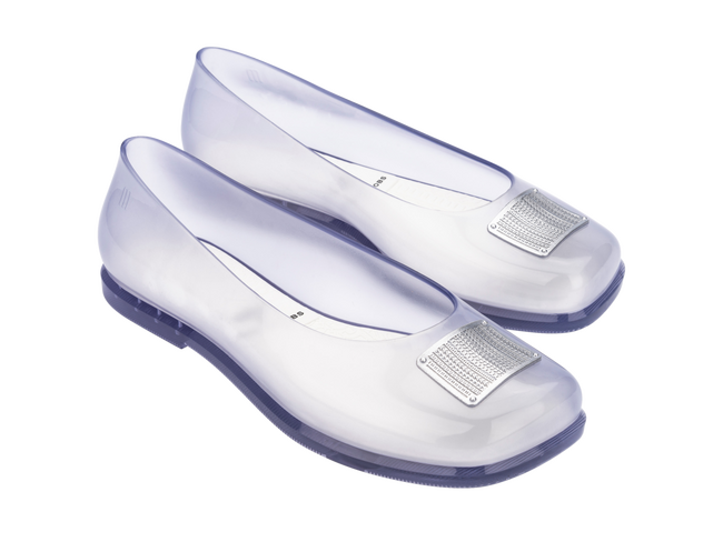 Melissa x Marc Jacobs Ruby バレリーナは、トレンドのバレエシューズをメタリックやクリアのユニークな素材でスタイリッシュに仕上げました。甲の飾りに細かく施されたマーク ジェイコブスのロゴは、メルフレックスを使用したペイント技法によって作られています。