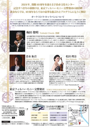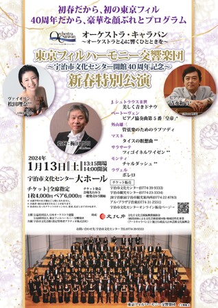 公益財団法人 東京フィルハーモニー交響楽団(以下、東京フィル/東京都新宿区/理事長:三木谷浩史)は、2024年1月13日(土)に京都の宇治市文化センター 大ホール(宇治市折居台1-1)で、指揮者 梅田俊明(うめだ・としあき)、ピアニスト清水和音(しみず・かずね)、ヴァイオリニスト松田理奈(まつだ・りな)とともに、【オーケストラ・キャラバン~オーケストラと心に響くひとときを~東京フィルハーモニー交響楽団宇治市文化センター開館40周年記念新春特別公演】を開催いたします。
