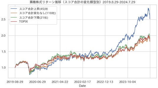 スコア変化なし(118社)・スコア下降(21社)との比較は以下の通りです。