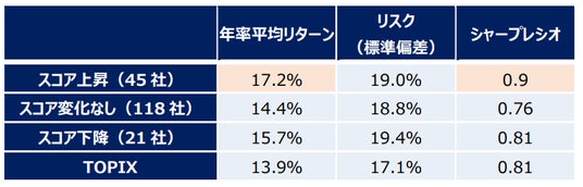 スコアが上昇した企業群(45社)について、ポートフォリオの優位性を示す指標であるシャープレシオ(リターン-リスクフレート/リスク)が最も高い結果となりました。