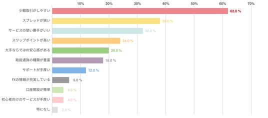 アンケートによれば、「少額取引のしやすさ」を挙げた投資家が62.0%で最も多い形となった。具体的には「1通貨から取引可能な手軽さ」を高く評価する声が多く集まった。