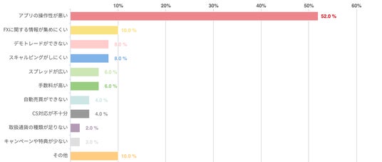 2位の「FX関連情報を取得しやすくしてほしい」(10.0%)の5倍以上の票を集めており、アプリやツールを好評価する投資家が多い一方で、使いにくさを感じる投資家の多さも浮き彫りになる結果となった。