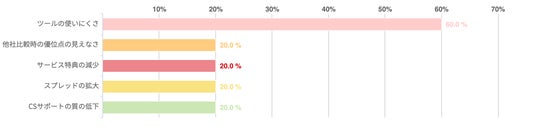 アンケートによれば、「取引ツールが使いにくい」と回答した投資家が60.0%で最も多い結果となった。次いで「他社と比較して優位性がなかった」「新規入会時よりも利用できるキャンペーンや特典が減った」「スプレッドが拡大した」「カスタマーサポートの質が悪くなった」がそれぞれ20.0%で並んだ。
