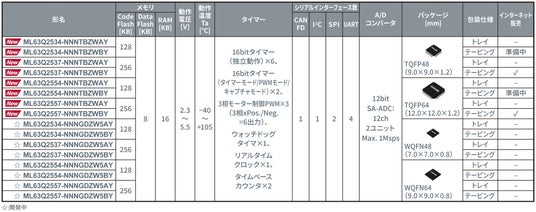AIマイコンは、メモリサイズやパッケージ、ピン数、梱包仕様の違いで16機種をラインアップ予定。2025年2月より量産を順次開始している製品(サンプル価格3,000円/個:税抜)は、TQFPパッケージの8機種です。そのうち、メモリ(Code Flash)サイズ256KB、テーピング梱包の2機種は、マイコン評価ボードとともにチップワンストップ(TM)、コアスタッフ(TM)オンラインなどで購入可能です。