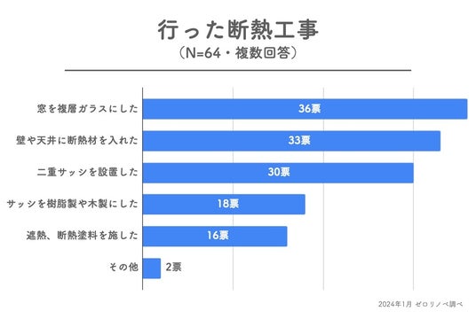 「断熱を目的とした工事をした」と答えた人に、行った断熱工事の内容を聞いたところ、以下の結果になりました。