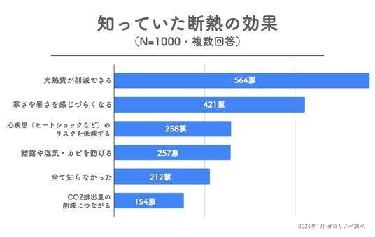 ■断熱で得られる効果として認知度が高いのは、「光熱費が削減できる」が564票で最多。