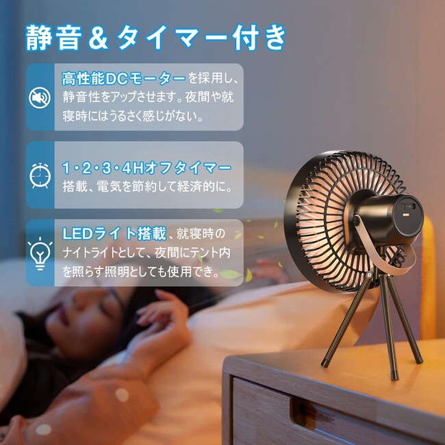 扇風機の風量は、弱風・中風・強風の3段階とリズム風の設定や、1-4時間のオフタイマーの設定も可能で、睡眠中や仕事中の風の当たり過ぎや切り忘れを防ぎます。手動で上向き30°の範囲で、自由に風向きを変えることが可能。LEDライトが付いており、夜間にテント内を照らす照明としても活用ができます。