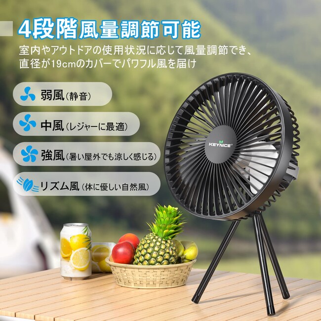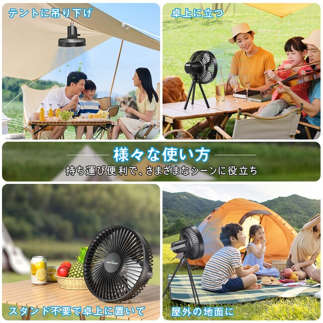 縮式の三脚スタンドを付属しており、必要に応じて扇風機の高さ調節(30~42cm)ができますので、リビングやダイニングの卓上などで、自由にご使用出来ます。三脚スタンドですので屋外の凹凸のある場所でも簡単に設置することができます。着脱が簡単ですので、外出、キャンプ中も移動させやすく携帯にも便利です。