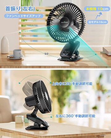 2022年新登場クリップ扇風機はタイマー設定機能が搭載され、2-4-8時間の3段階で時間設定ができます。設定時間の経過時点で自動停止しますので、睡眠中や仕事中の風の当たり過ぎを防止できます。そして、左右の自動首振り機能を搭載し、手動で左右に360°回転、上向きに35度の調節が可能で、自由にお好みの風向きにすることができます。