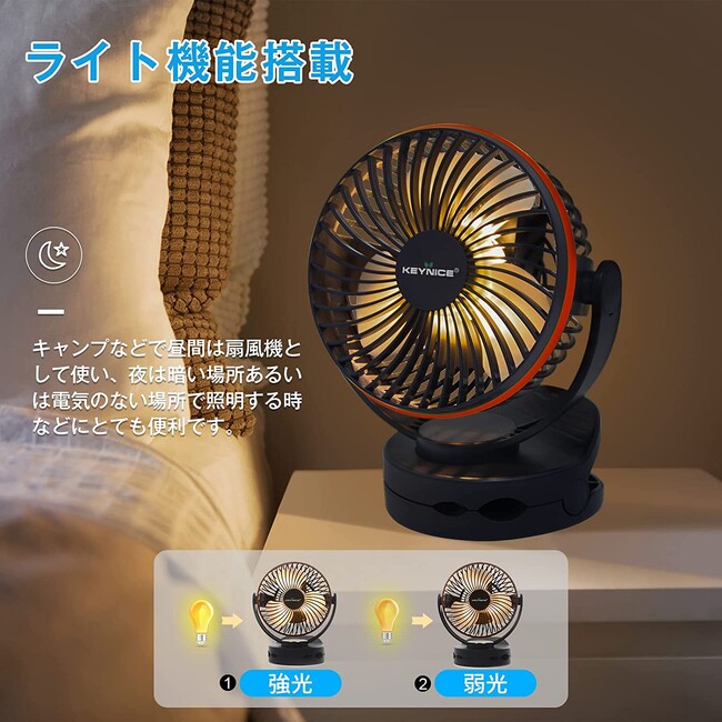 手動で左右、上下を360度調整が可能、様々な角度から気持ち良い涼しい風が吹きます。風力は4段階で切り替え可能。使用時はお好みに合わせて自由に風量を調節できます。扇風機にはLEDライトが付いており、明るさを2段階に切り替え可能です。
