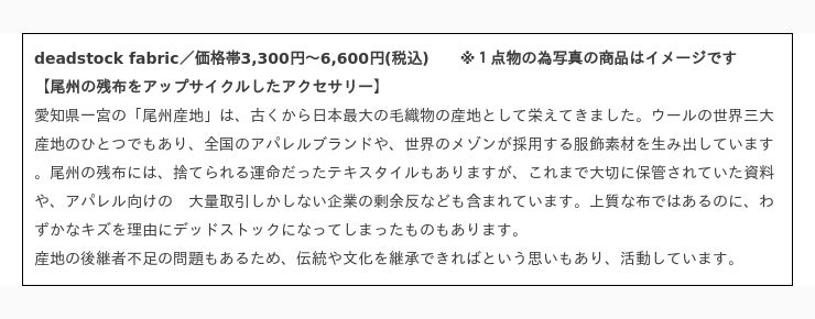 今回、千葉県初出店となる2ブランドは、伝統や文化が背景にある上質な素材の残布(デッドストック)や、河川や海を守る取り組みから生まれたマイクロプラスチックをアップサイクルした素材を使用し、1点ものも数多いハンドメイドアクセサリーを展開します。ファッション・トレンド性が高く、生まれ変わった魅力溢れる商品と共に、ブランドを通して、地球や人に優しい、未来に向けた取り組みを発信していきます。