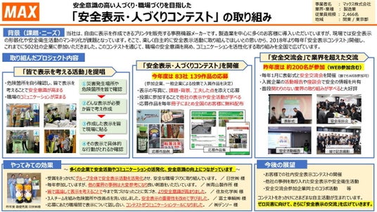マックス株式会社(証券コード:6454)は、企業及び団体による安全な職場づくりの取り組みを表彰する「SAFEアワード」において、「安全表示・人づくりコンテスト」の取り組みが、〈製造業、建設業、運輸業等〉企業等間連携部門にて最高賞であるゴールド賞を受賞したことをお知らせします。
