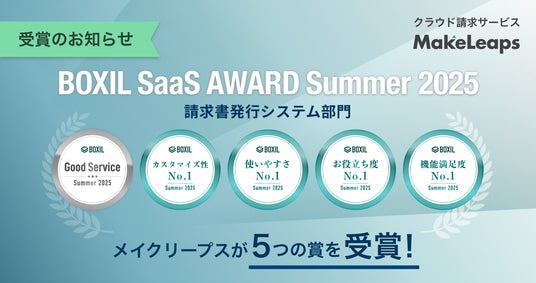 リコーグループのメイクリープス株式会社(本社:東京都目黒区、代表取締役社長:岡田 泰、以下メイクリープス)が提供するクラウド型請求管理サービス「MakeLeaps(メイクリープス)」は、スマートキャンプ株式会社(以下「スマートキャンプ」)が主催する「BOXIL SaaS AWARD Summer 2025」請求書発行システム部門で「Good Service」ほか4つのNo.1に選出されました。「Good Service」選出は12期連続となります。