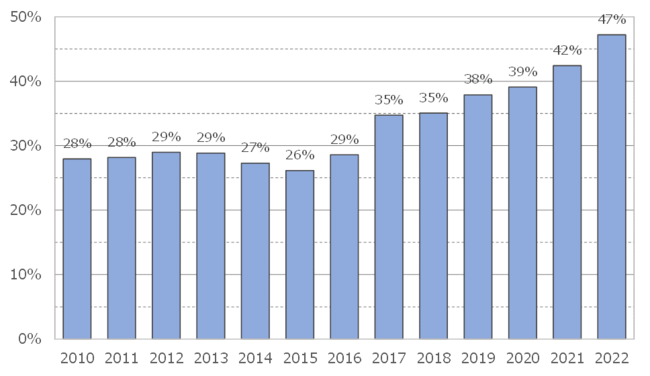 当社が2020年に発表した調査結果※において、親ひとり世帯や娘夫婦との同居ではキッチン1つで食事を共にするなどのシェア志向が高いことを指摘しました。今回、親子同居のうち母の年齢別シェア二世帯(キッチン1つまたは1つ+ミニキッチンの二世帯住宅)の割合を、当社ご契約時アンケートの同居予定家族の分析でみたところ、母の年齢が高いほど割合が高いことが分かりました。二世帯同居において高齢の親との同居率が高まる現在の傾向を鑑みると、それに合わせてシェア二世帯割合が高まっていくことが予想されます。娘夫婦同居の比率についても2021年に過去最高となる47%に達し、増加傾向が続いています。