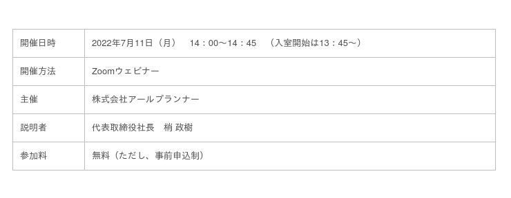 戸建住宅を中心とした住宅プラットフォーム事業を展開する株式会社アールプランナー(本社:名古屋市東区、代表取締役社長:梢 政樹、以下「当社」)は、2022年7月11日14時より個人投資家向けIRセミナーを実施いたします。