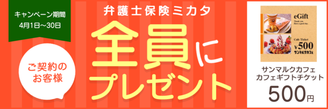 対象期間中に弁護士保険STATION経由で、ミカタ少額短期保険株式会社「弁護士保険ミカタ」の契約申込を完了し、ご契約が成立されたお客様全員に、「サンマルクカフェ カフェギフトチケット500円」をプレゼントします。