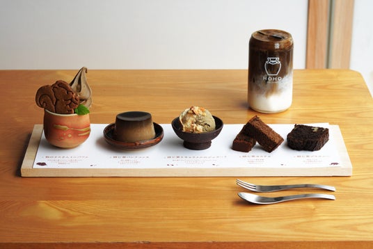 手作り焙じ茶ブラウニーに焙じ茶ソフト、ナッツとキャラメルソース