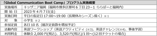 こどもの職業・社会体験施設「キッザニア」の企画・運営を行うKCJ GROUP 株式会社(本社:東京都中央区、代表取締役社長:圓谷 道成、以下 KCJ GROUP)は、「キッザニア福岡」(福岡県福岡市)の営業時間外を活用し地域に貢献するための新たな取り組みとして、小学生が対象の放課後英語実践プログラム「Global Communication Boot Camp」を、2023年4月7日(金)から開始します。本プログラムの詳細は以下を参照ください。なお、国内3か所あるキッザニアのうち、本プログラムの導入は福岡が初となります。