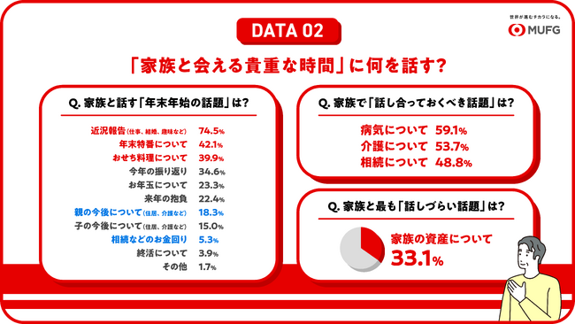 年末年始の話題について、「親の今後について(住居、介護など)」を話す人は5人に1人、さらに、「相続などのお金回り」はわずか20人に1人という結果に。一方で、最も話しづらい話題は「家族の資産について(33.1%)」。