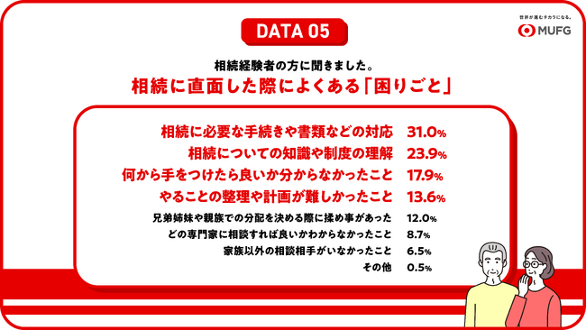 相続に直面した際に約6割が事前の準備ができていない結果に。さらに、実際に困ったこととしては、制度への理解や事務手続きへの対応などが挙げられました。