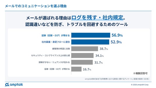 次に、「メール」と「電話」が選ばれる理由については、ユーザーがそれぞれの特性を明確に使い分けていることが分かりました。 メールが選ばれる最大の理由は「証跡(記録・ログ)が残せる(56.9%)」や「社内稟議・承認フローに適合する(52.9%)」といった、トラブル回避や社内規定への対応を目的としたものです。