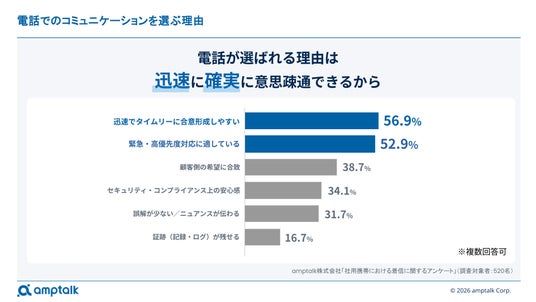 一方で電話は、「迅速でタイムリーに合意形成しやすい(56.9%)」や「緊急・高優先度対応に適している(52.9%)」といった、スピードと確実な意思疎通を目的として選ばれています。