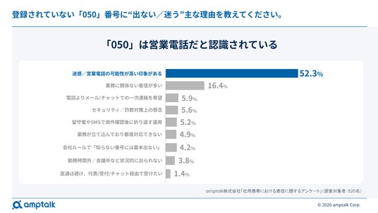 登録されていない050番号に出ない、あるいは迷う理由については、「迷惑/営業電話の可能性が高い印象がある(52.3%)」が最多となりました。次いで「業務に関係ない着信が多い(16.4%)」が挙げられており、050番号がビジネスシーンにおいて「不要な営業電話」として広く認識されていることが、通電率を大きく下げる要因となっています。