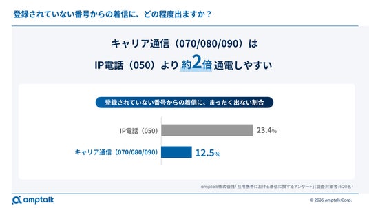登録されていない番号からの着信に「まったく出ない」と回答した割合を比較したところ、IP電話(050)では23.4%に達したのに対し、携帯電話番号(070/080/090)では12.5%に留まりました。携帯電話番号はIP電話よりも約2倍通電しやすいという実態が明らかになりました。