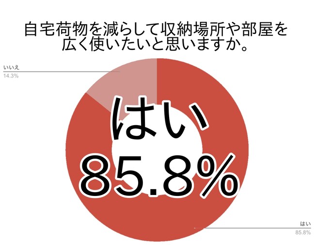 アンケートでは自宅荷物を減らして収納場所や部屋を広く使いたいと思うと答えた方が9割弱(85.8%)でした。ほとんどの方が、もっと自宅荷物を減らしてスペースをすっきりさせたいと考えていることになります。
