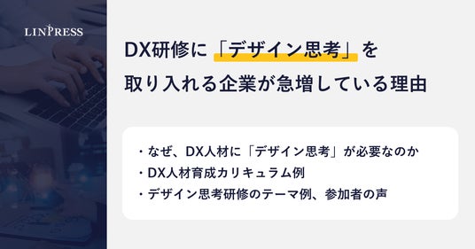 企業向けDX人材育成研修を提供する株式会社リンプレス(本社:東京都港区、代表取締役社長:三宮壮、以下、リンプレス)は、DXに取り組む企業様に向けて、『DX研修に「デザイン思考」を取り入れる企業が急増している理由』と題した記事を公開しましたので、お知らせします。
