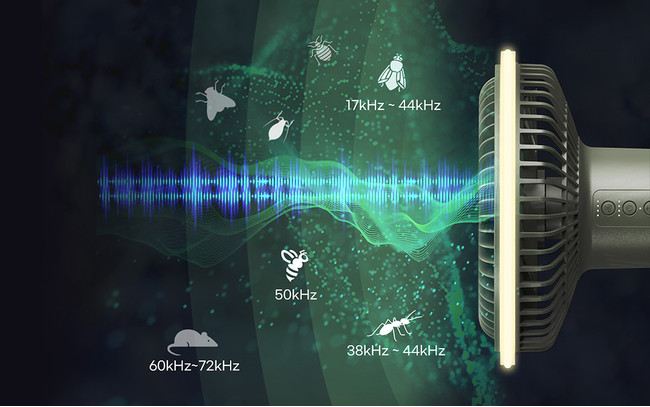KRUCAは、人間の耳では聞こえない超音波発生装置を内蔵、不快害虫、ネズミなどのが嫌がる周波数(20kHz~55kHz)の超音波を発生させます。BBQ時や夜間など虫などが寄ってきやすい場面で活躍します。