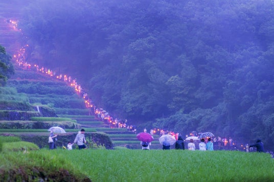 火手(ほて)と呼ばれる松明を持って、棚田を行列で歩く虫送りは、田んぼの害虫を追い払い、豊作を願うための行事です。無数の松明の光の行列が、夜のあぜ道を進み美しい水田に映る様子は、幻想的な風景を作りだします。